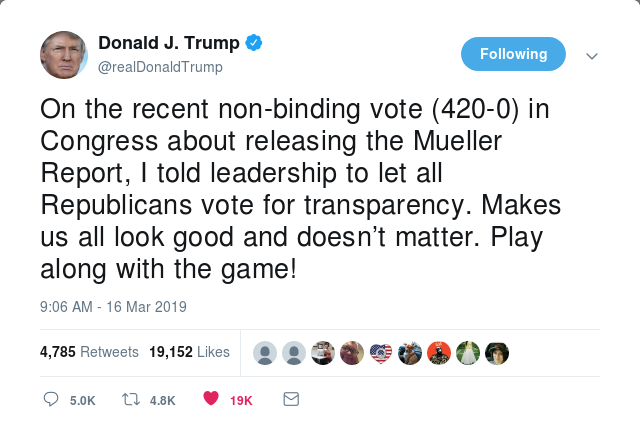 Frågan är väl kanske om detta verkligen gör att demokraterna fortfarande framhärdar hårdare om att Muellers rapport måste göras offentlig snabbt...