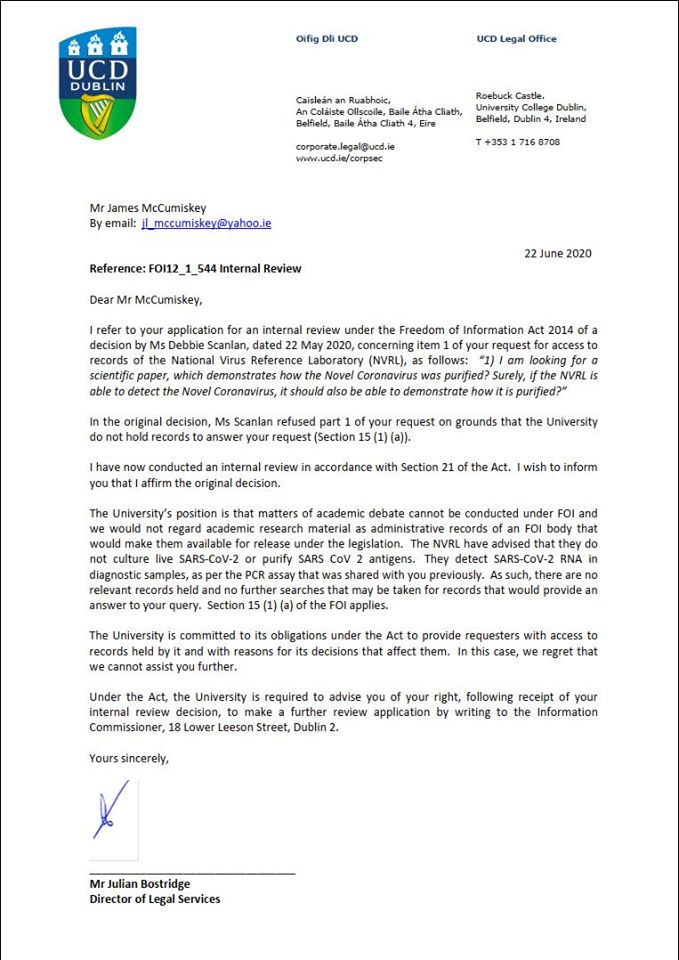 Reply sent by the National Virus Reference Laboratory in Ireland regarding the inquiry into the scientific evidence for the isolation and purification of the claimed "SARS-CoV-2".