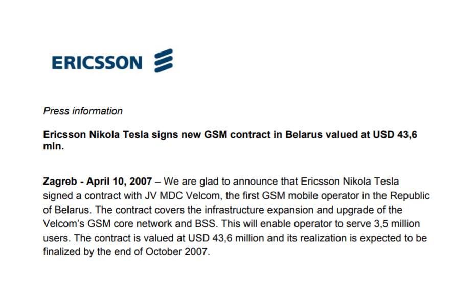 Ericsson, som hävdar att dess närvaro i Vitryssland har positiva effekter, utarbetade: "Tillsammans med våra partners har vi arbetat hårt för att förbättra livet för invånarna i Vitryssland genom att tillhandahålla prisvärda telekommunikationer och nya typer av tjänster så att utvecklingen av teletjänster bidrar positivt till ekonomin och samhället. "