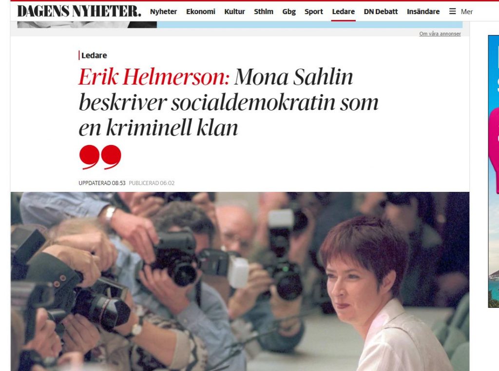 Mona Sahlin talar om ”en sorts odödlighetskänslor” efter Tobleroneaffären. ”Jag började väldigt tidigt – och på ett förrädiskt sätt – betrakta makten som en del av mig. Socialdemokraterna blev ett hem och partiet var en familj som skyddade mig”, säger hon också. Det är slående ärligt och påminner faktiskt om beskrivningen av en kriminell klan.