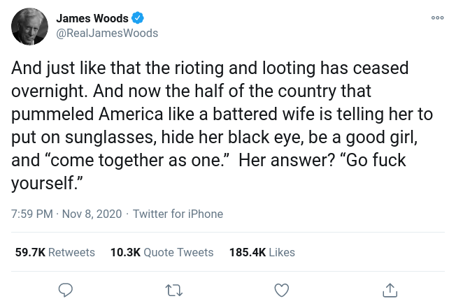 “And just like that the rioting and looting has ceased overnight. And now the half of the country that pummeled America like a battered wife is telling her to put on sunglasses, hide her black eye, be a good girl, and “come together as one.” Her answer? “Go fuck yourself.””