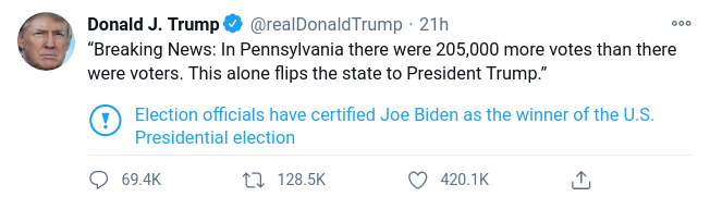 ““Breaking News: In Pennsylvania there were 205,000 more votes than there were voters. This alone flips the state to President Trump.””