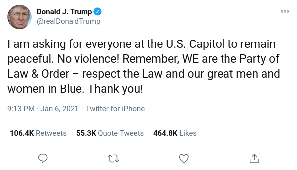 “I am asking for everyone at the U.S. Capitol to remain peaceful. No violence! Remember, WE are the Party of Law & Order – respect the Law and our great men and women in Blue. Thank you!”