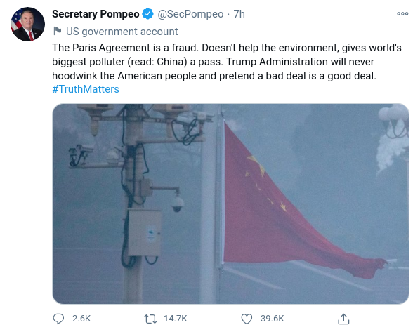 “The Paris Agreement is a fraud. Doesn't help the environment, gives world's biggest polluter (read: China) a pass. Trump Administration will never hoodwink the American people and pretend a bad deal is a good deal. #TruthMatters”
