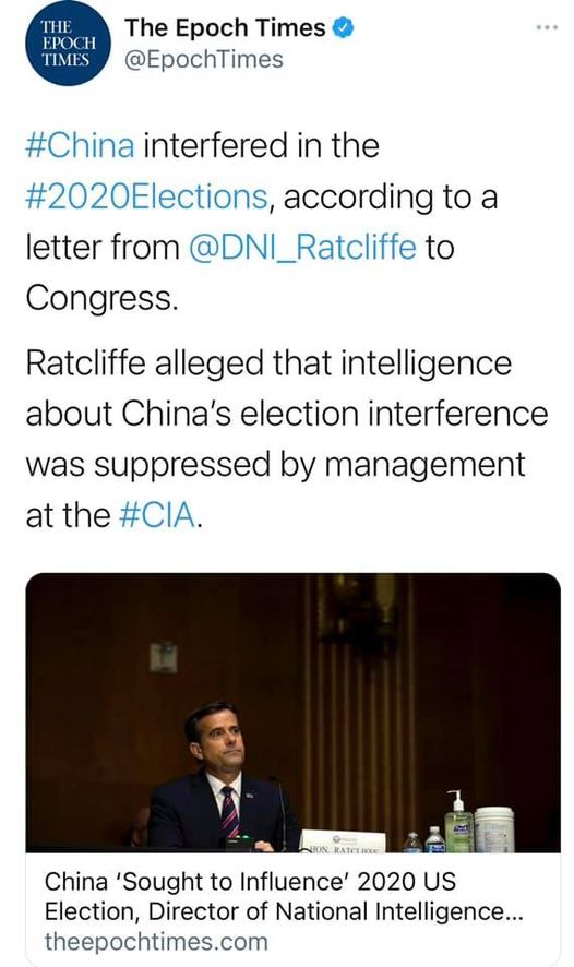 “In the letter Ratcliffe alleges that intelligence about China’s election interference was suppressed by management at the CIA, which pressured analysts to withdraw their support for the view.”