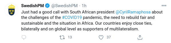 “Just had a good call with South African president @CyrilRamaphosa about the challenges of the #COVID19 pandemic, the need to rebuild fair and sustainable and the situation in Africa. Our countries enjoy close ties, bilaterally and on global level as supporters of multilateralism.”
