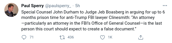 “Special Counsel John Durham to Judge Jeb Boasberg in arguing for up to 6 months prison time for anti-Trump FBI lawyer Clinesmith: “An attorney—particularly an attorney in the FBI’s Office of General Counsel—is the last person this court should expect to create a false document.””
