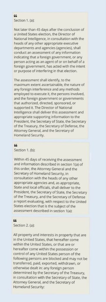 10 h · Trump’s Executive Order 13848 on election interference has two 45 day periods. The second one ends on February 1st. This is when people & companies who were involved will have their assets frozen while being investigated. February should prove exciting.