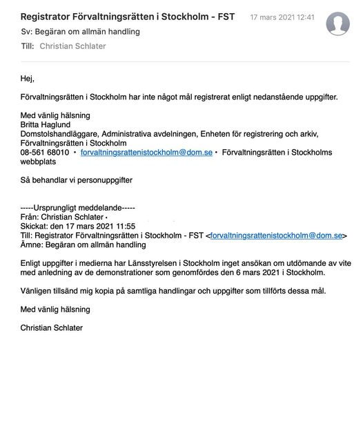 Christian Schlater 13 tim · Kommer ni i håg när Länsstyrelsen i Stockholm gick ut och ojade sig i medierna efter den sk. Tusenmannamarschen den 6 mars 2021? De skulle ansöka om utdömande av vite. Det är många händelse som iscensätts för att förvilla allmänheten. Myndigheter, medier och en hel del olika individer ägnar sig åt teater helt enkelt.
