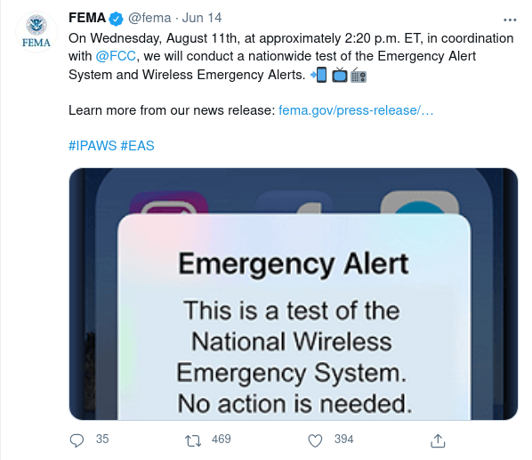 “On Wednesday, August 11th, at approximately 2:20 p.m. ET, in coordination with @FCC, we will conduct a nationwide test of the Emergency Alert System and Wireless Emergency Alerts. Learn more from our news release: https://t.co/3zxlGXKwRt #IPAWS #EAS”