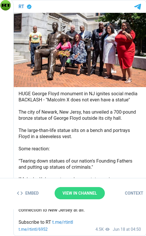 Ja nu krävs det faktiskt att Alla står upp för vad som är rätt och riktigt och dessutom att man argumenterar för sin sak på verklighetsbaserade grunder.... https://t.me/rtintl/6952... t.me RT HUGE George Floyd monument in NJ ignites social media BACKLASH - "Malcolm X does not even have a statue" The city of Newark, New Jersy, has unveiled a 700-pound bronze statue of George Floyd outside its city hall. The large-than-life statue sits on a bench and portrays Floyd in a sleeveless vest. So...