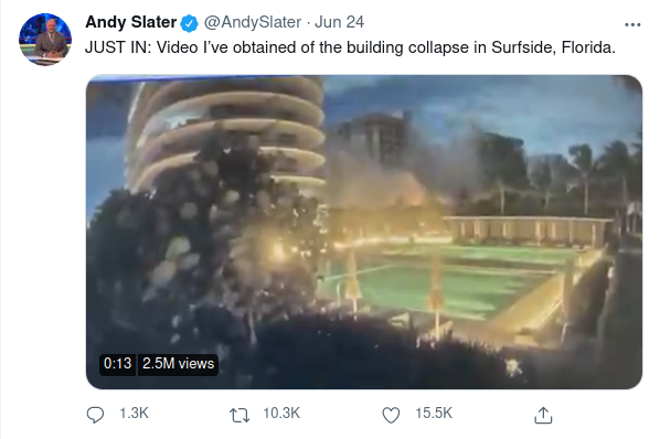 https://mobile.twitter.com/AndySlater/status/1408051917964595202?ref_src=twsrc%5Etfw%7Ctwcamp%5Etweetembed%7Ctwterm%5E1408051917964595202%7Ctwgr%5E%7Ctwcon%5Es1_c10&ref_url=https%3A%2F%2Fstorywarrant.com%2F2021%2F06%2F24%2Fvideo-captures-horrifying-moment-that-miami-high-rise-collapsed%2F&fbclid=IwAR1bpQckj-M24gZ2q6mQCob71V7pMWDp0gd_1JFpRCUsFQ4901BZHrqAN30