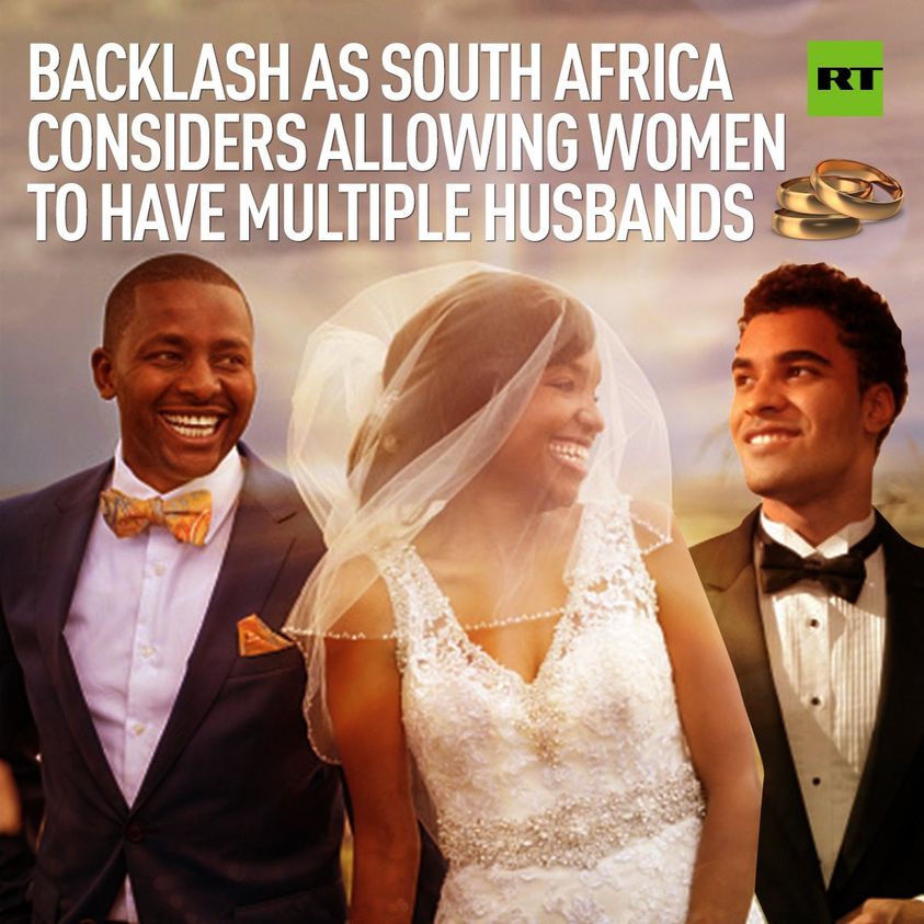 RT Statskontrollerad media från Ryssland · 10 tim · I now pronounce you men and wife. South Africa’s Department of Home Affairs has suggested that women should be allowed to marry more than one husband. The plans are part of a wider movement by the South African government to reform and modernize the country’s Marriage Act. This would mark the biggest overhaul of marriage laws since white-minority rule ended in 1994. The newly published green paper has caused huge debate across South African social media over the legitimacy of polyandry. The act of polygamy, a man having more than one wife, is already legal in South Africa. The prospect of allowing women to have more than one husband has angered conservatives and some religious groups. Leader of the opposition African Christian Democratic Party, Reverend Kenneth Meshoe, claimed it would “destroy society” if the same marriage rights were granted to women. Theology professor, Collis Machoko, believes that the backlash comes from traditional African groups who are ‘not ready for true equality,’ and that those who object to the changes don’t know what to do with women who they cannot control. Aaron Motsoaledi of the African National Congress explained that the green paper was not the official policy position of the government. However, he encouraged people to engage in the debate in good faith, and not allow the discussion to become a war of words. Follow our Telegram t.me/rtintl