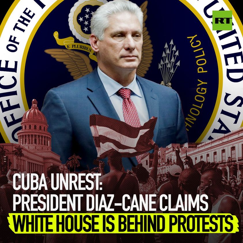 Kuba ' s president har hävdat att USA ligger bakom vågen av de senaste protesterna som har gripit ön nation. Mitt i pågående matbrist och strömavbrott gick tusentals människor ut på gatorna i huvudstaden Havanna på söndagen. Men Miguel D íaz-Canel - som efterträdde Ra úl Castro som kommunistpartiets första sekreterare, och de facto ledare för Kuba, tidigare i år - skyllde på bristen på USA: s handelsembargo, som just nu är det längsta som är sådant sanktion i historien. I en televiserad adress sa han att Washington hade bedrivit 'en ekonomisk kvävningspolitik för att framkalla social oro i landet,' och tillade att oroligheterna provocerades av en klar och grundligt planerad kampanj. President Biden har redan kastat sin tyngd bakom protestanterna och konstaterar att den kubanska regeringen måste tjäna deras [folkets] behov i detta vitala ögonblick snarare än att berika sig själva. ′′ Mer: https://on.rt.com/bc7c