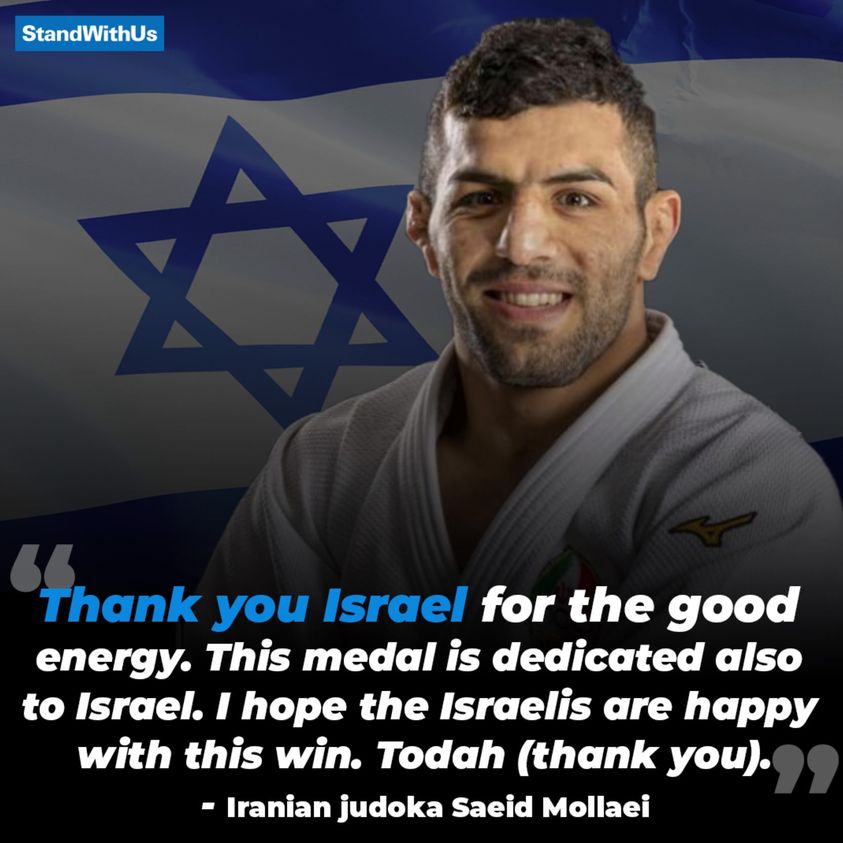 StandWithUs 28 juli kl. 14:00 · Former Iranian Judoka Saeid Mollaei, who defected from Iran and now represents Mongolia, dedicated his silver medal win at the Tokyo Olympics to Israel, thanking the country and its people for their support. We are so proud of you champion!