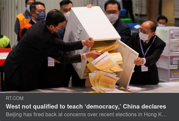 Zhao uppmanade de nationer som kritiserade valet i Hongkong att " se sig i spegeln ", eftersom de själva inte var de " bästa eleverna i demokratiklassrummet och ... definitivt inte kvalificerade att vara lärare ", sa han. Han avslutade med att råda Kinas kritiker att " ta hand om sitt eget hus först ", och pekade på " misslyckanden i kampen mot Covid, ... politisk polarisering , [och] rasdiskriminering. ” En hög tjänsteman vid den kinesiska regeringens representationskontor i Hong Kong slog också emot påståenden från Five Eyes-länderna – Australien, Kanada, Nya Zeeland, Storbritannien och USA – om att demokratin i Hong Kong håller på att " urholkas". ” Han kallade kritiken för en ” politisk fars ” och tillade att ” dagarna då utländska styrkor kunde använda sina politiska agenter för att blanda sig i Hongkongs angelägenheter är över.”