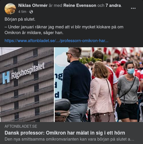– Vi såg en väldigt snabb ökning av antalet fall och indikationerna är att vi sedan dess har haft en anmärkningsvärd minskning, säger Waasila Jassat på NICD, det sydafrikanska folkhälsoinstutitet. Att jämföra mellan olika länder bör dock göras med ett mått av försiktighet säger chefen för det afrikanska centret för smittskyddskontroll till Washington Post, då de skiljer sig i befolkningsstruktur bland annat. Som exempel har Sydafrika en större andel ung befolkning, jämfört med Danmark. ”Kan inte göra nya varianter” Omikronvarianten är betydligt mer smittsam än de tidigare varianterna och man tror också att vaccinen kan vara mindre effektiva på den. Men det finns också hoppfulla tecken som pekar på att den ger mildare sjukdom. Data från sydafrikanska hälsomyndigheter visar att antalet sjukhusinläggningar är lägre för omikron än för delta. Enligt data mellan oktober och tidiga december löper en omikronsmittad person 80 procents lägre risk att läggas in på sjukhus. Data från Storbritannien anger siffran till 60 procent. Tiden en covidpatient vårdas på sjukhus är också kortare. Nu tror Lundgren att coronaviruset kan ha kommit till en återvändsgränd. – Det kan faktiskt vara så att viruset har målat in sig i ett hörn det inte kan gå vidare ifrån. Det vill säga att den inte kan göra nya varianter som är konkurrenskraftiga med omikron, säger Jens Lundgren. Inom en snar framtid räknar den danske professorn med att forskarvärlden kommer att kunna ge ett tydligt besked om variantens egenskaper och slå fast huruvida den ger mildare sjukdom. – Under januari räknar jag med att vi blir mycket klokare på om omikron är mildare, säger han.