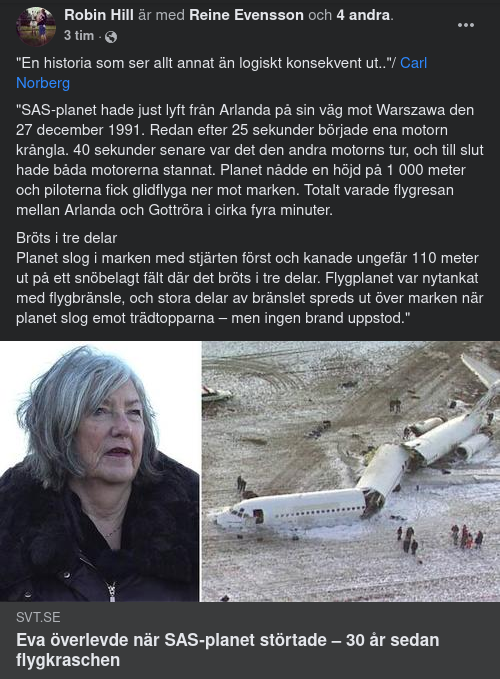 Eva överlevde när SAS-planet störtade – 30 år sedan flygkraschen Uppdaterad idag 15:11 Publicerad idag 05:30 Händelsen har kallats ”Miraklet i Gottröra”. Det är i dag 30 år sedan flygplanskraschen norr om Arlanda inträffade, där alla passagerare överlevde. Ombord fanns 129 personer som fick bevittna att båda motorerna stannade en kilometer upp i luften. Eva Björnemark jobbade som så kallad purser ombord, och var arbetsledare för cabinpersonalen. Hon förstod direkt att något var mycket fel när hon hörde ett slammer från motorerna. – Det lät som om man tumlar stenar i en tvättmaskin, säger hon. Det hade jag aldrig hört förut under de 23 åren som jag hade flugit. SAS-planet hade just lyft från Arlanda på sin väg mot Warszawa den 27 december 1991. Redan efter 25 sekunder började ena motorn krångla. 40 sekunder senare var det den andra motorns tur, och till slut hade båda motorerna stannat. Planet nådde en höjd på 1 000 meter och piloterna fick glidflyga ner mot marken. Totalt varade flygresan mellan Arlanda och Gottröra i cirka fyra minuter. Bröts i tre delar Planet slog i marken med stjärten först och kanade ungefär 110 meter ut på ett snöbelagt fält där det bröts i tre delar. Flygplanet var nytankat med flygbränsle, och stora delar av bränslet spreds ut över marken när planet slog emot trädtopparna – men ingen brand uppstod. Flera personer skadades men alla överlevde. Förutom fyra personer så tog sig alla 129 personerna sig ut själva ur planet. – Det första jag gjorde var att kolla om jag var hel, och det var jag ju, säger Eva Björnemark. Hon påbörjade en evakuering och tog sig själv ut ur planet. Senare visade det sig att hon hade brutit två nackkotor. Bristande rutiner Orsaken till kraschen var isbildning på vingarna som lossnade och sögs in i motorerna. Isen orsakade motorpumpningar som fick motorerna att haverera. Statens haverikommission kom fram till att SAS rutiner kring isbeläggning på vingarna brast. SVT Uppsala har varit i kontakt med SAS som skriver i ett mejl: ”Utbildningen på området är i dag är betydligt tydligare och mer fokuserad på området. Både piloter och markpersonal samarbetar i dag då väderleksförhållanden gör att is kan förekomma på vingarna.”