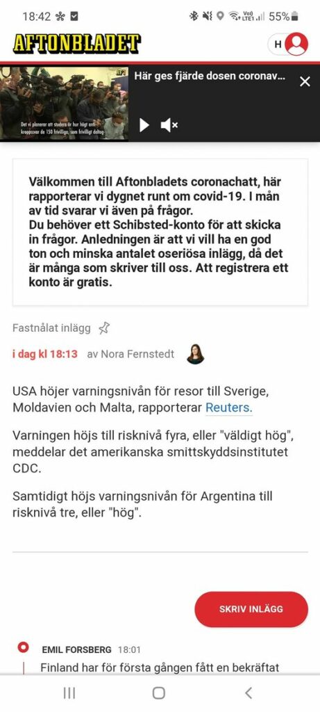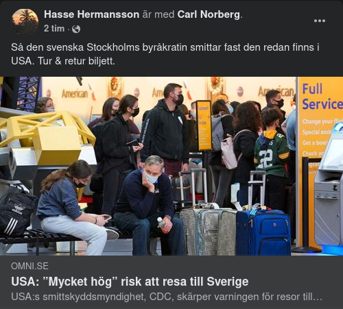 USA: ”Mycket hög” risk att resa till Sverige USA:s smittskyddsmyndighet, CDC, skärper varningen för resor till Sverige på grund av hög smittorisk, rapporterar Reuters. Risken höjs från nivå 3, ”hög”, till den högsta nivån ”mycket hög”. Amerikanska resenärer uppmanas att undvika resor till Sverige. Samma höjning gäller även för Malta och Moldavien. För Argentina höjs risken från nivå 2 till ”hög”.