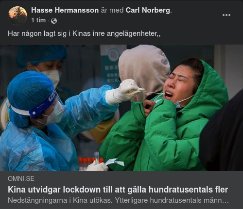 Kina utvidgar lockdown till att gälla hundratusentals fler Nedstängningarna i Kina utökas. Ytterligare hundratusentals människor tvingas stanna hemma, skriver AFP. Sedan tidigare har staden Xi’an med 13 miljoner invånare stängts ner. Nu införs liknande restriktioner för boende i många delar av staden Yan’an, ett 30-tal mil från Xi’an. Restriktionerna i Xi’an har fått många invånare att uttrycka desperation på sociala medieplattformen Weibo. ”Det finns ingen mat, jag får inte lämna min byggnad, och snabbnudlarna håller på att ta slut... hjälp mig!” skriver en användare enligt nyhetsbyrån. Nedstängningarna är de mest omfattande i Kina sedan coronaviruset först upptäcktes i Wuhan och elvamiljonersstaden sattes i karantän.