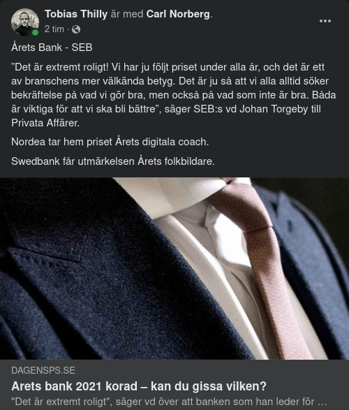 SEB är enligt tidningen Privata Affärer, som står bakom utmärkelsen, Årets bank 2021.