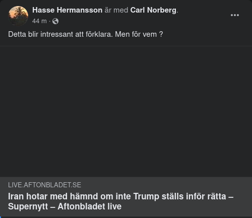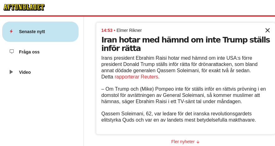 https://live.aftonbladet.se/supernytt/news/iran-hotar-att-haemnas-paa-trump-tvaa-aar-efter-mordet-av-soleimani.m5HwH0ws0?fbclid=IwAR0CiKJoNatZkgrKdBK2-xzfwSzv8FkKSmd2i5RkT_aoI-tO3VAG2pinipM
