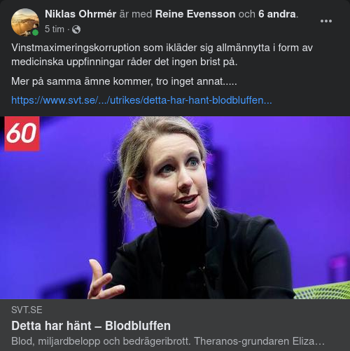 Detta har hänt – Blodbluffen Uppdaterad idag 07:14 Publicerad idag 06:37 Blod, miljardbelopp och bedrägeribrott. Theranos-grundaren Elizabeth Holmes fick både pengar, framgång och hyllningar för sin blodprovsinnovation – som visade sig vara en bluff. Nu riskerar hon ett fängelsestraff på 20 år. • Stanforduniversitetet Efter ett års studier i kemiteknik presenterar Elizabeth Holmes sin idé för en lärare: Ett “plåster” som ska kunna ta blodprov och genomföra en mängd analyser. Hon är säker på att uppfinningen ska revolutionera sjukvården och har redan sökt patent. • Theranos 2004 startar Holmes företaget som sedan döps till Theranos för att ta fram sin patenterade teknik. Hon hoppar av sina studier. • Eliten investerar På två år får Holmes ihop nästan sex miljoner dollar i investeringar. Tidningsmogulen Rupert Murdoch ska ha bidragit med stora summor och i bolagets styrelse satt högdjur som USA:s tidigare utrikesminister Henry Kissinger. • Silicon Valley Idén utvecklas tillsammans med rekryterade talanger från Google och Apple till en maskin som med bara några droppar blod från fingret ska kunna utföra 70 olika blodprover. Löftet: Det är snabbare, bättre och billigare än vanliga blodprov och kan upptäcka allt ifrån cancer till diabetes och könssjukdomar. • Ung miljardär Holmes hyllas av investerare, styrelseledamöter och media. Hon jämförs med Steve Jobs, får utmärkelser för sin ekonomiska framgång och pryder bland annat Forbes, Inc. och Fortunes omslag. • Framgångssaga 2014 är företaget Theranos värderat till nio miljarder dollar, cirka 87 miljarder kronor. På huvudkontoret arbetar 700 anställda. Allt verkar för bra för att vara sant. • Avslöjandet 2015 får medicinreportern John Carreyrou ett tips, börjar gräva och bekräftar misstanken: Blodproverna är en bluff. Apparaterna som visas upp för investerare fungerar i själva verket inte. Instrument från andra företag används istället och resultaten som visas upp är förinspelade. • Implosion Amerikanska myndigheter bedömer att uppfinningen hotar patientsäkerheten. Verksamheten stängs ned och Theranos förlorar sitt värde. • Rättegång 2021 står Holmes åtalad för bedrägeri och riskerar 20 års fängelse. Hon förnekar brott.