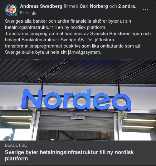 https://bladet.se/nyheter/sverige-byter-betalningsinfrastruktur-till-ny-nordisk-plattform/?fbclid=IwAR1NJcZp5IQ04jNWiAy5mAbGM8gqIWVmtOLISCQBmDjfpxoS4q_213RmNWQ