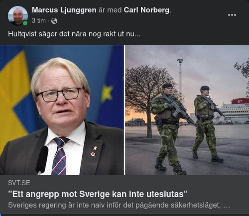 – Det är klart att det finns en risk. Ett angrepp mot Sverige kan, precis som vi säger i totalförsvarsbeslutet i riksdagen, inte uteslutas. Vi har ett spänt läge som inte är bra i Europa i dag, där den europeiska säkerhetsordningen ifrågasätts.