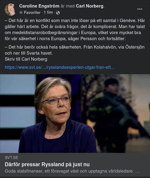 – Det här är en konflikt som man inte löser på ett samtal i Genève. Här gäller hårt arbete. Det är svåra frågor, det är komplicerat. Man har talat om medeldistansrobotbegränsningar i Europa, vilket vore mycket bra för vår säkerhet i norra Europa, säger Persson och fortsätter: