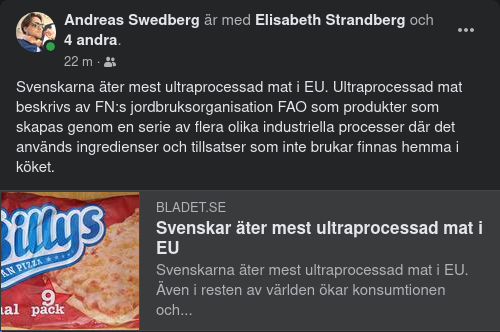 Svenskarna äter mest ultraprocessad mat i EU. Även i resten av världen ökar konsumtionen och kopplas till den globala fetmaepidemin. Nu införs rekommendationer i USA och flera andra länder. Det skriver SvD. Nuggets, mjukost och fryst pizza som värms upp i mikrovågsugnen, liksom frukostflingor, fruktyoghurt, bantningspulver och veganska köttsubstitut. Mer än 40 procent av den energi vi stoppar i oss kommer enligt en ny studie från ultraprocessad färdigmat med hög andel socker. Ultraprocessad mat beskrivs av FN:s jordbruksorganisation FAO som produkter som skapas genom en serie av flera olika industriella processer där det används ingredienser och tillsatser som inte brukar finnas hemma i köket. Andreas Swedberg