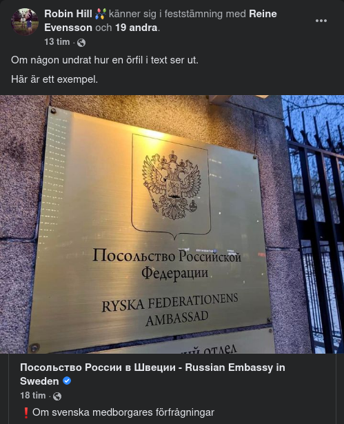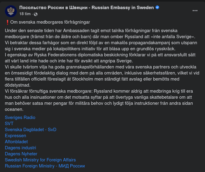 Under den senaste tiden har Ambassaden tagit emot talrika förfrågningar från svenska medborgare (främst från de äldre och barn) där man omber Ryssland att «inte anfalla Sverige».