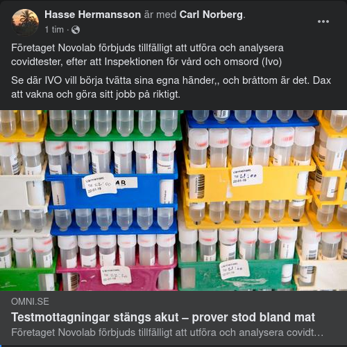 Testmottagningar stängs akut – prover stod bland mat Företaget Novolab förbjuds tillfälligt att utföra och analysera covidtester, efter att Inspektionen för vård och omsord (Ivo) påpekat en rad brister. Det rapporterar P4 Göteborg. Bland annat förvarades PCR-prov i kylskåp tillsammans med mat och dryck. Vissa provsvar kom för snabbt för att proverna skulle ha hunnit analyseras och en mottagning saknade rinnande vatten så att personal inte kunde tvätta händerna. Inspektionerna gjordes i Novolabs lokaler i bland annat Älvängen, Göteborg, Borås och Örebro. https://omni.se/testmottagningar-stangs-akut-prover-stod-bland-mat/a/v5yygj