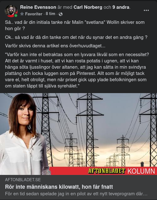 Varför kan inte el betraktas som en lyxvara likväl som en necessitet? Att det är varmt i huset, att vi kan rosta potatis i ugnen, att vi kan hänga söta ljusslingor över altanen, att jag kan sätta in min svindyra plattång och locka luggen som på Pinterest. Allt som är möjligt tack vare el, helt otroligt, men när priset gick upp ylade befolkningen som om staten täppt till själva syrehålet.