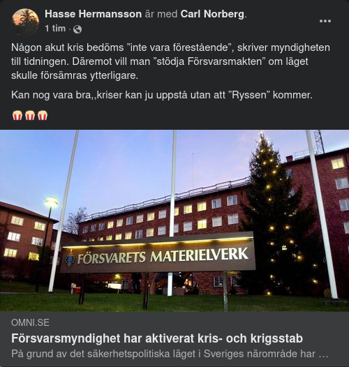 Ja detta blir ju bara bättre Hur var det BTW med svängdörrarna mellan generalstabskåren och försvarsindustrin...... ........................................................................................... " Försvarets materielverk (FMV) som förser försvaret med bland annat stridsflygplan, ubåtar och radarsystem har aktiverat kris- och krigsstab på grund av det säkerhetspolitiska läget. Myndigheten skriver till SvD att ”en akut kris inte bedöms vara nära förestående” men att FMV vill anpassa verksamheten utifrån att den säkerhetspolitiska situationen i Sveriges närområde har försämrats den senaste månaden. FMV:s uppdrag är att upphandla och tillhandahålla svenska försvaret med materiel och tjänster. – Givet vår viktiga roll att stödja Försvarsmakten är det viktigt att FMV tidigt vidtar åtgärder för att kunna hantera en eventuell framtida händelseutveckling, säger presschef Henrik Hedberg i ett mejl till SvD. Staben aktiverades i ”närtid” och påminner om hur FMV arbetat med anledning av coronapandemin. Dess uppgifter består bland annat i att samordna kommunikation, sammanställa lägesbilder och föreslå åtgärder. Åtgärden görs för att ”stödja Försvarsmakten och vara redo att agera i det fall det skulle ske ytterligare försämringar”. – Det handlar med andra ord om att myndigheten ska vara förberedd och planera för det som vi aldrig vill ska inträffa, skriver Henrik Hedberg."