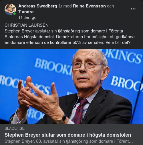 Stephen Breyer, 83, avslutar sin tjänstgöring som domare i Förenta Staternas Högsta domstol. ”Jag tänkte inte jobba där tills jag dör”, sa han själv några månader innan beslutet offentliggjordes. Och han ämnar sluta när denna mandatperioden närmar sig slutet.