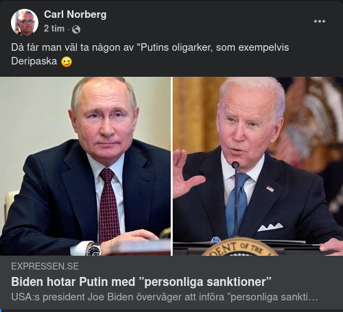 Enligt Biden kan svaret från USA bli att införa ”personliga sanktioner” mot Putin. Det skriver Joy Malbon, reporter för tv-kanalen CTV, på Twitter.