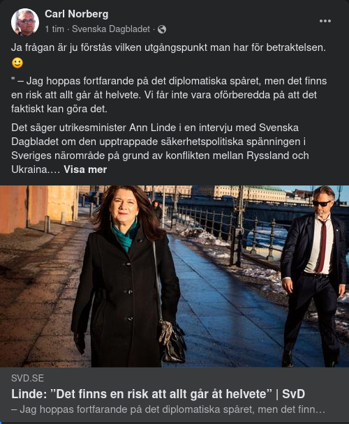Det säger utrikesminister Ann Linde i en intervju med Svenska Dagbladet om den upptrappade säkerhetspolitiska spänningen i Sveriges närområde på grund av konflikten mellan Ryssland och Ukraina.