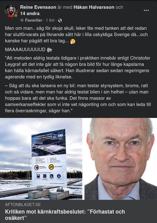 – Vi behöver göra ytterligare studier innan vi fattar ett sådant här beslut om att säga ja. Jag tycker att regeringen sviker i att ställa svaga villkor på fortsatta processen. Man hade kunnat ställa tuffare villkor på kärnkraftsindustrin att ge svar på de här frågorna annars knuffar vi risker och kostnader på kommande generationer, säger han.
