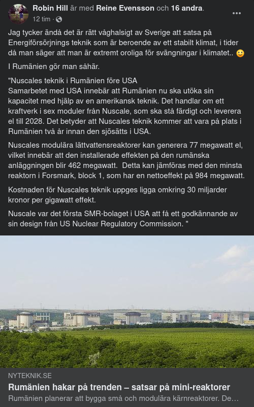 Samarbetet med USA innebär att Rumänien nu ska utöka sin kapacitet med hjälp av en amerikansk teknik. Det handlar om ett kraftverk i sex moduler från Nuscale, som ska stå färdigt och leverera el till 2028. Det betyder att Nuscales teknik kommer att vara på plats i Rumänien två år innan den sjösätts i USA.
