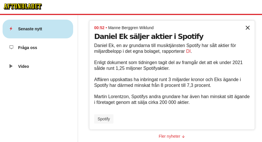 https://live.aftonbladet.se/supernytt/news/daniel-ek-saeljer-aktier-i-spotify.fcdYfMrqa?fbclid=IwAR1yfOlFyUIYgqwCpT0IUBSa99Xj7Ilafp5-Z80BnDESelh7KIucGcF0bwI