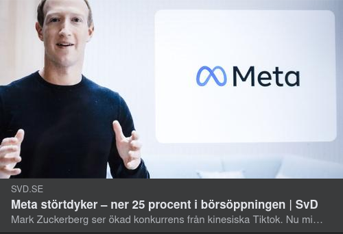 Sedan aktien toppade för ett knappt halvår sedan har bolagets börsvärde tappat rejält – från 900 miljarder dollar till runt 700 miljarder dollar, konstaterar Malmqvist. Konkurrensen från Tiktok finns också med som en delförklaring i att skapa press på Meta.