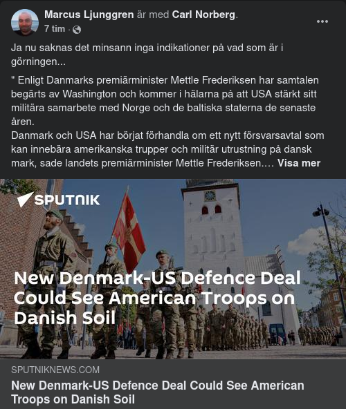" Enligt Danmarks premiärminister Mettle Frederiksen har samtalen begärts av Washington och kommer i hälarna på att USA stärkt sitt militära samarbete med Norge och de baltiska staterna de senaste åren.