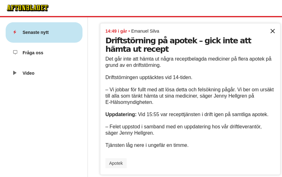 https://live.aftonbladet.se/supernytt/news/driftstoerning-paa-apotek-gaar-inte-haemta-ut-medicin.SHg-RADtI?fbclid=IwAR0zB_ojGEv3E4l9U36ICXunEHuHVGtvNTuriJj9F6Bec0Ik7ZQTmCM8VQw