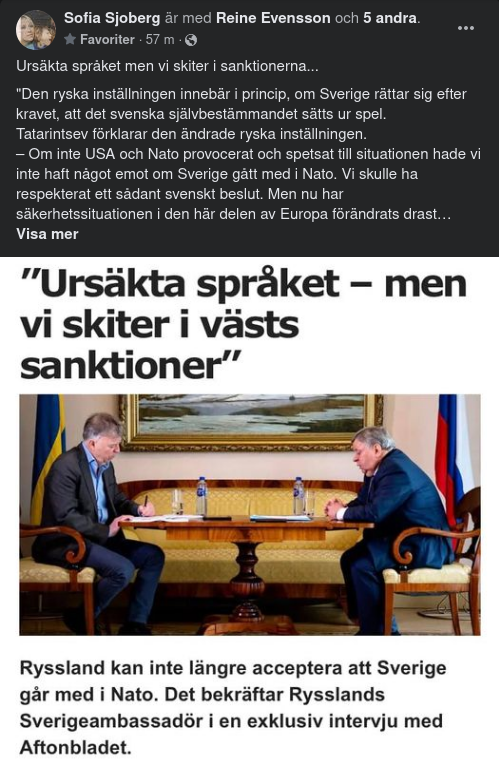– Om en allians utvidgar sitt territorium och gör det allt närmare Rysslands gräns hur ska vi tolka detta? Den enda rimliga tolkningen är att det är Nato och väst som skapar oro för Rysslands säkerhet. Alla vet att Nato är ett aggressivt militärt block. I Jugoslavien 1999 bombade de städer som Belgrad.