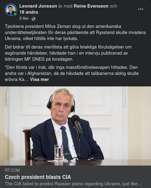 Tjeckiens president Milos Zeman slog ut den amerikanska underrättelsetjänsten för deras påstående att Ryssland skulle invadera Ukraina, vilket hittills inte har lyckats.