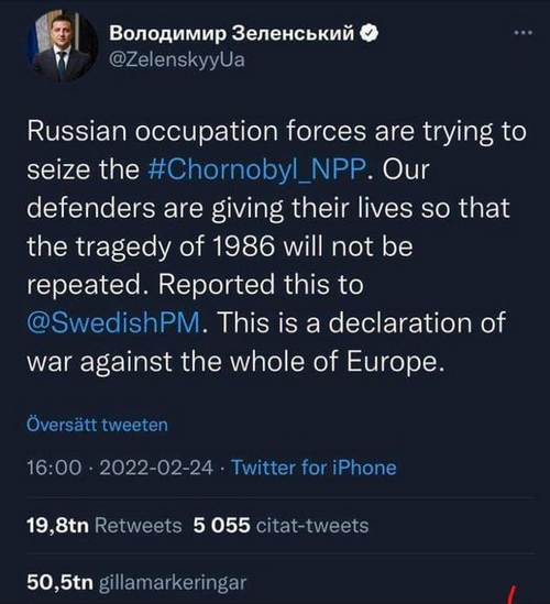 "Ukrainas president Volodymyr Zelensky twittrade på torsdagskvällen att ryska trupper försöker fånga kärnkraftverket i Tjernobyl i den norra delen av Kievregionen. Anläggningen var platsen för katastrofen 1986, som orsakade massiv förorening av det omgivande området och delar av Europa.