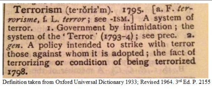 "Omedelbart efter den första fasen av den franska revolutionen var en period känd som Reign of Terror, eller helt enkelt The Terror. Den började i september 1793 och varade under en period av nio månader till slutet av juli 1794. Under den tiden tiotusentals som ansågs vara fiender till revolutionen avrättades. Terrorn, och själva terrorismen blev känd som en form av regeringsskrämsel, allt tack vare de aktiviteter som pågick i Frankrike. Det var 1795, ett år efter att massmorden hade slutade, att Oxford English ordbok först använde ordet terrorism för att beskriva tyranniskt statligt beteende, och det var i samband med Reign of Terror i Frankrike."