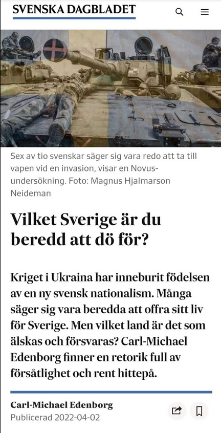Ny nationalism i Sverige... Är det bra det? Är det det nya? Många säger sig vara beredda att offra sitt liv för Sverige. Vem då?