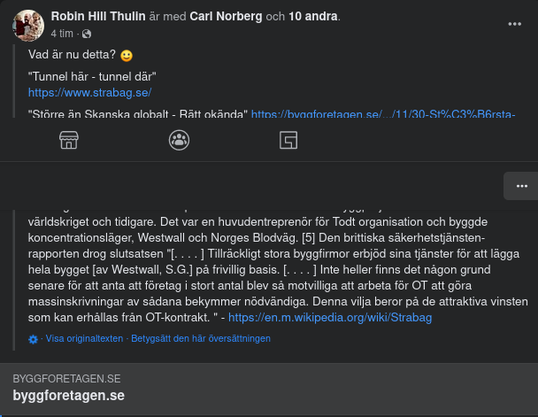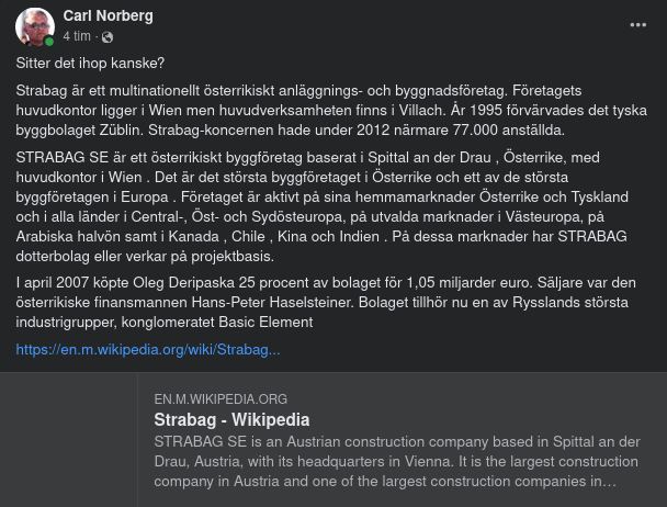 "Större än Skanska globalt - Rätt okända" https://byggforetagen.se/.../11/30-St%C3%B6rsta-2019.pdf"I april 2007 köpte Oleg Deripaska 25 procent av bolaget för 1,05 miljarder euro. Säljare var den österrikiske finansmannen Hans-Peter Haselsteiner. Bolaget tillhör nu en av Rysslands största industrigrupper, konglomeratet Basic Element" - https://sv.m.wikipedia.org/wiki/StrabagStrabag var en av de främsta profitörerna av de nazistiska byggprojekten under andra världskriget och tidigare. Det var en huvudentreprenör för Todt organisation och byggde koncentrationsläger, Westwall och Norges Blodväg. [5] Den brittiska säkerhetstjänsten-rapporten drog slutsatsen "[. . . . ] Tillräckligt stora byggfirmor erbjöd sina tjänster för att lägga hela bygget [av Westwall, S.G.] på frivillig basis. [. . . . ] Inte heller finns det någon grund senare för att anta att företag i stort antal blev så motvilliga att arbeta för OT att göra massinskrivningar av sådana bekymmer nödvändiga. Denna vilja beror på de attraktiva vinsten som kan erhållas från OT-kontrakt. " - https://en.m.wikipedia.org/wiki/Strabag